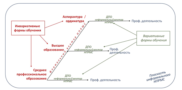 Особый интерес в нашей работе вызывают вопросы информального образования. Здесь мы приходим к заключению, что число вариантов образовательного движения является достаточным для того, чтобы понимать его не векторным, а пространственным. С точки зрения организации непрерывного профессионального развития медицинских специалистов как системы его информальная составляющая является смыслообразующим компонентом, так как способствует определению соответствия собственных личностных ценностей ключевым нравственным принципам, специфике профессии, возрастным потребностям и возможностям и культурному контексту социума.