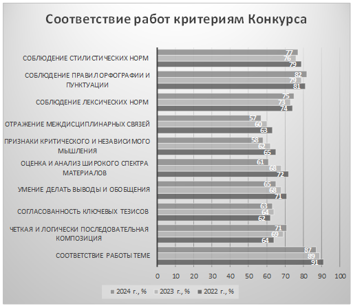 Согласно результатам анализа на соответствие выборки конкурсных работ критериям, можно отметить следующее: соответствие работ теме Конкурса подтверждено довольно высокими результатами – 91 % в 2022 г., 89 % в 2023 г. и 87 % в 2024 г. Некоторое снижение показателей связано с использованием участниками Конкурса инструментов искусственного интеллекта (ИИ), поскольку каждая работа проверяется на применение ИИ-контента при написании работ онлайн-сервисом «ИИ-детектор». Построение четкой и логически последовательной композиции работы отмечено на уровне 54, 69 и 71 % работ, соответственно. Значительное повышение может быть объяснено включением методических рекомендаций по организации композиционной структуры академического эссе в Положение о Конкурсе в 2023 г. Показатели по согласованности ключевых тезисов и утверждений демонстрируют значительный рост в 2023 г. по сравнению с 2022 г. – с 54 % до 64 %, который в 2024 г. незначительно снизился до 63 %, что также может быть объяснено введением методических рекомендаций. Тем не менее показатель по умению делать выводы и обобщения показывает устойчивое снижение – с 71 % до 68 %, а позднее до 65 %. Данное обстоятельство непосредственно связано с использованием ИИ при написании конкурсных работ обучающимися. Показатель по оценке и анализу широкого спектра материалов и источников также показывает уверенное снижение – 72, 68 и 61 %, соответственно. Отметим, что показатели по критическому и независимому мышлению и отражению междисциплинарных связей показывают значительное снижение: 65, 62, 58 и 63, 60, 57 %, соответственно, что также связано с использованием ИИ в процессе создания конкурсных работ. В отношении показателей по соблюдению лексических норм литературного языка, оформлению текста с соблюдением правил орфографии и пунктуации и соблюдению стилистических норм литературного языка статистические данные довольно высокие и изменяются незначительно: 74, 73, 75; 81, 79, 82 и 75, 76, 77 %, соответственно, что может объясняться достаточно высоким уровнем сформированности языковых навыков у обучающихся.
