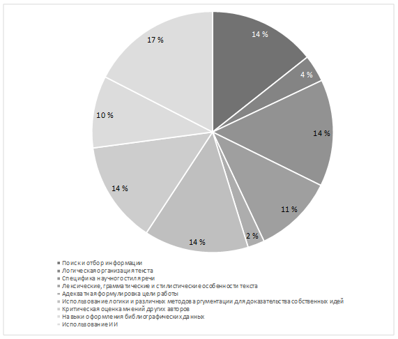 Согласно результатам анализа по определению основных трудностей, с которыми сталкиваются обучающиеся при написании академического эссе, можно отметить следующее: использование ИИ при написании работы является наиболее частотным показателем и составляет 17 % от общего количества работ; за ним следуют использование научного стиля речи, логики и методов аргументации, поиск, отбор и критическая оценка информации – по 14 % каждый. Считаем данные показатели взаимосвязанными, поскольку современное развитие ИИ не позволяет данной технологии качественно анализировать и синтезировать информацию. К сожалению, обучающиеся часто используют ИИ в своей учебной деятельности, полностью полагаясь на цифровой ресурс. Трудности, возникающие на уровне употребления корректных лексических, грамматических и стилистических единиц, составляют 11 % от общего числа выборки и связаны с недостаточно развитыми языковыми компетенциями обучающихся. Показатель некорректного оформления библиографических данных составляет 10 % и также часто является следствием использования ИИ обучающимися. Логическая организация текста нарушена в 4 % случаев, что может быть объяснено несформированностью когнитивных навыков обучающихся. Показатель адекватной формулировки цели работы составляет 2 % и, в основном, связан с низким уровнем мотивации обучающихся к написанию академического эссе (на Конкурс присланы работы, не соответствующие теме).