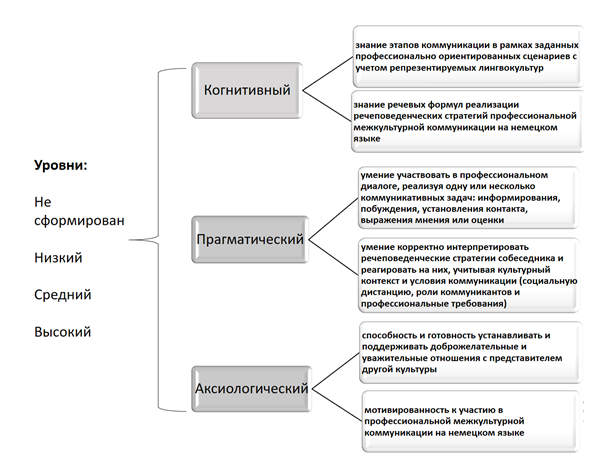 Когнитивный критерий определяется знаниями, демонстрируемыми студентами в ситуациях профессионального взаимодействия с носителями другой лингвокультуры. Это знание репертуара речеповеденческих стратегий на немецком языке и речевых формул их реализации; знание этапов профессиональной коммуникации. Диагностическим методом может выступать тестирование.