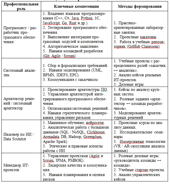 Таким образом, компетентностно-ролевой подход рассматривается как интегративная методологическая конструкция, которая позволяет проектировать образовательный процесс подготовки ИТ-специалистов с учетом как содержательного наполнения (компетенции), так и организационного контекста (роли). В таблице 1 представлено ядро некоторых востребованных в настоящее время на рынке труда компетентностно-ролевых моделей: роли отражают реальные позиции в ИТ-компаниях, компетенции связывают теоретическую базу и практику, а методы обеспечивают реализацию модели в образовательном процессе.