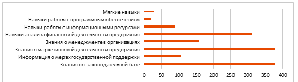 Большинство респондентов говорит о недостаточности реальной информации о грантах, различных мерах актуальной государственной поддержки бизнеса в рамках обучения в системе среднего профессионального образования. Точно так же слабыми местами в данном случае являются знания в области менеджмента, навыки работы с программным обеспечением, информационными ресурсами, формирование мягких навыков. При этом знания нормативно-правовой базы, маркетинговой деятельности, а также финансового анализа предприятия получили наивысшие оценки большинства опрошенных.