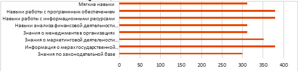 На рисунке 1 представлены оценки респондентов в диапазоне «от 7 до 10». Несмотря на то что все представленные параметры оказались достаточно важными, в представлении респондентов, наиболее актуальными (получившими наибольшие оценки по шкале от 1 до 10) выступают «знания о мерах государственной поддержки», «навыки работы с программным обеспечением», «навыки работы с информационными ресурсами».
